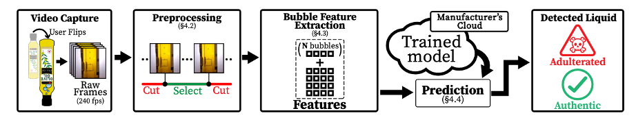 전체적인 시스템의 구조는 위의 그림과 같다. 논문은 크게 두 개의 phase를 가지는데, Bootstrapping phase와 Verification phase로 나뉜다. 쉽게 생각하면 Bootstrapping phase는 레이블이 있는 비디오 데이터셋을 구축하고 liquid content model에 대한 모델을 학습시키는 과정입니다. Verification phase는 이용자의 device에서 video를 촬영하고 preprocessing, feature extraction, 그리고 bootstrapping phase에서 학습된 모델을 가지고 진품 가품 여부를 판별하는 과정을 의미합니다.