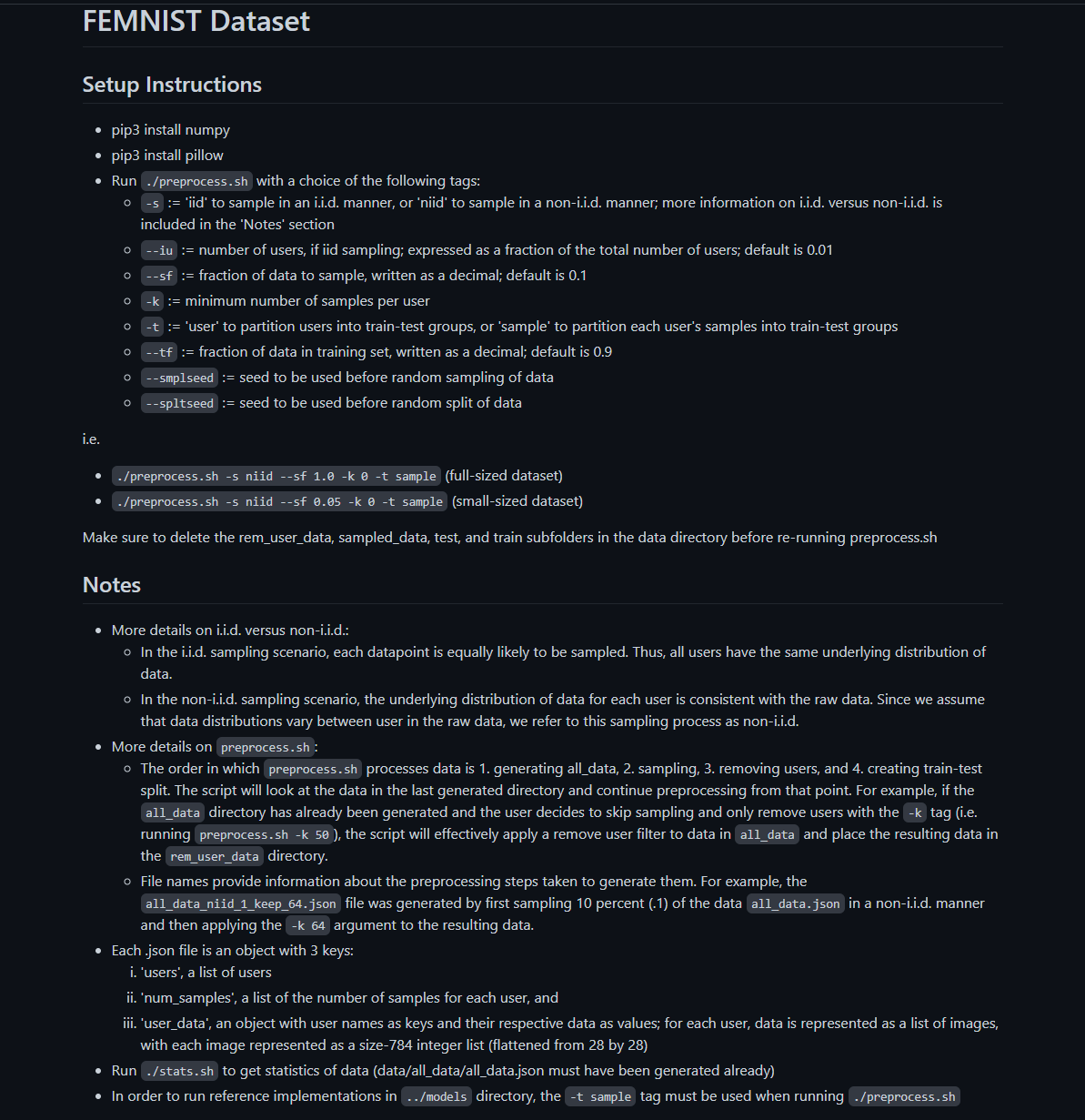 뭐 별거 없어 보이는데, 실제로 별거 없다. ./preprocess.sh만 실행하면 성공적으로 FEMNIST dataset이 다운로드 되고 적절한 형태로 preprocessing 된다! 간단하지만, 앞서 이야기하였듯 FL dataset의 구성은 자유도가 꽤나 높아서 내가 원하는 setting을 위해서 여러 parameter를 설정해줄 필요가 있다. 'README.md'를 열어서 내용을 읽어주자.