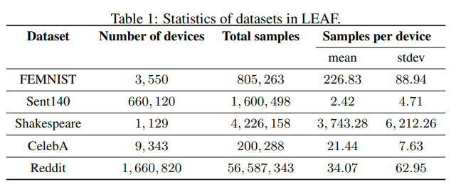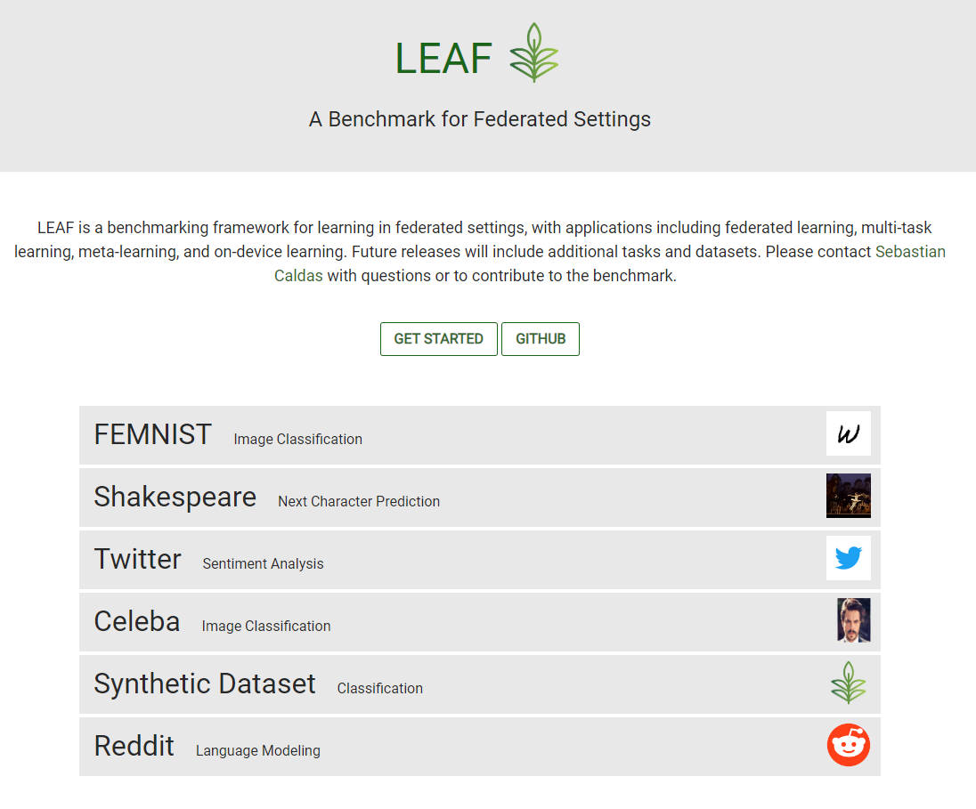 문제는 non-iid는 유일하지 않고, unbalance의 정도와 client의 수 모두 임의로 설정할 수 있는 parameter이다. 따라서 FL 관련 연구들에서 사용하는 데이터셋에 대한 공정한 평가가 쉽지 않은 것이 현실이다. 이런 문제를 해결하기 위해서 CMU와 Google, Determined AI에서 LEAF라는 FL을 위한 Benchmark를 공개했다. LEAF는 데이터셋 뿐만 아니라 기본적인 Federated Learning Framework 또한 제공하여 연구에 활용하기 간편한 도구라고 볼 수 있으시겠다.