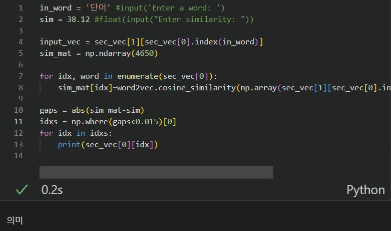 2022/12/20의 문제를 예시로 한 번 정답을 맞춰봅시다. 우선 꼬맨틀에 접속해 아무 간단한, 일반적인 단어를 입력합시다. '단어'라는 단어를 입력하니 매우 운이 좋게도 이것이 38.12%의 유사도로 75등에 rank된 단어 임을 알 수 있었습니다. 자 그렇다면, 우리는 다시 코드로 돌아와서 이 '단어'라는 단어와, 유사도 38.12를 프로그램에 입력합니다. 이는 각각 변수 in_word와 sim에 저장됩니다. 저희는 이미 대부분의 단어들에 대해서 임베딩된 vector에 대한 정보를 가지고 있기 때문에, 입력한 단어의 임베딩 vector를 가지고 와서 input_vec에 저장해 둡시다. 이후 정답으로 나올 수 있는 모든 단어들의 vector들과 입력한 단어의 vector 사이의 유사도를 구해 sim_mat이라는 변수에 저장해둡니다. 꼬맨틀에서 사용하는 코사인 유사도를 사용합니다.