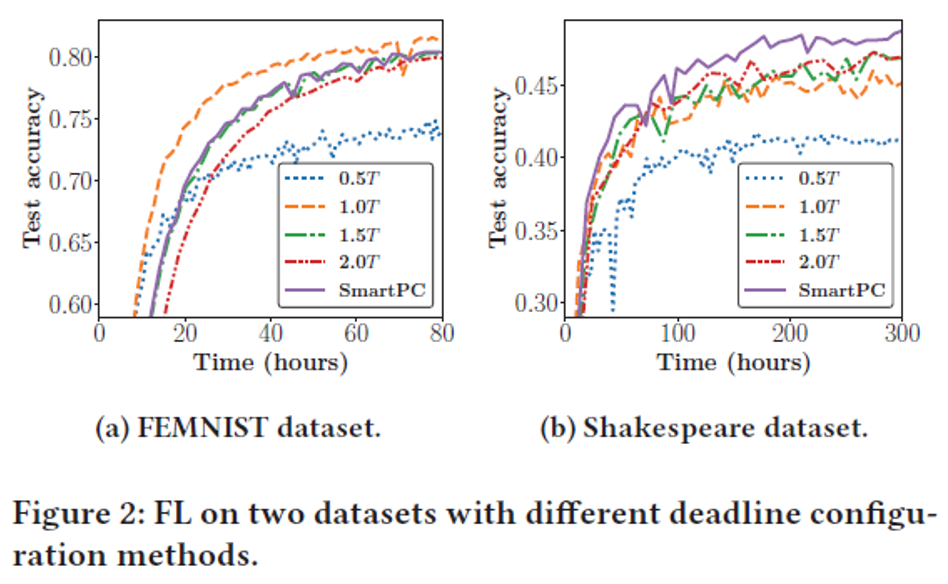 위 figure는 두번째 motivational study로 T는 round당 소요되는 평균 시간이다. SmartPC는 해당 연구와 유사하게 학습에 소요되는 시간등에 대한 deadline을 adaptive하게 설정하는 등의 접근을 처음으로 한 논문으로 소개된다. Deadline을 설정 하는 것이 학습에 영향력을 미친다는 것과 SmartPC 알고리즘이 모든 데이터에 대해서 잘 작동하지 않는다는 것 두가지를 지적한다. 따라서 효과적인 deadline 설정 방식이 필요함을 시사한다.